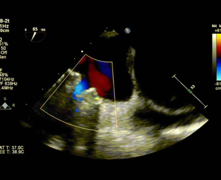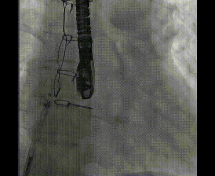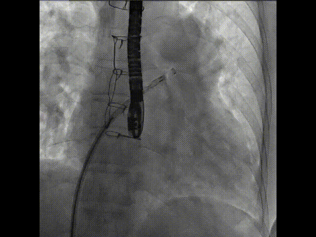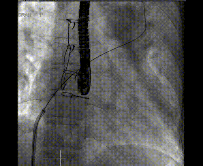 術(shù)中首先在局麻下穿刺股動(dòng)脈、股靜脈,完成心導(dǎo)管檢查評(píng)估后轉(zhuǎn)為全麻,在食道超聲引導(dǎo)下穿刺房間隔,穿刺成功后將加硬導(dǎo)絲送入左上肺靜脈建立軌道,根據(jù)患者病情行球囊預(yù)擴(kuò)張后植入6mm孔徑房間隔造孔支架,經(jīng)透視及食道超聲評(píng)估支架左右盤展開良好,夾持于房間隔兩側(cè),固定穩(wěn)定、位置良好,食道彩超顯示房水平右向左為主分流,分流孔直徑符合預(yù)期大小,心導(dǎo)管檢查評(píng)估達(dá)到預(yù)期效果,釋放造孔支架。術(shù)后12h患者下床活動(dòng),恢復(fù)順利,擬于近日完善術(shù)后評(píng)估后出院。
