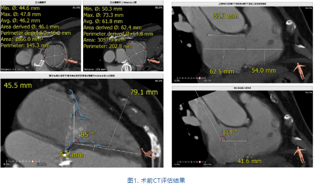 接受本次治療的是一例三尖瓣重度反流的患者,NYHA心功能Ⅲ級(jí)。主訴“反復(fù)活動(dòng)后氣促1年,下肢水腫4個(gè)月”。入院N末端B型腦鈉肽前體(NT-proBNP)3161pg/ml。心電圖提示:心房顫動(dòng),ST-T改變。術(shù)前超聲提示:重度三尖瓣關(guān)閉不全,右心房擴(kuò)大,三尖瓣收縮期位移(TAPSE)14mm,左房增大,左室收縮功能正常低值,主動(dòng)脈瓣、二尖瓣機(jī)械瓣功能良好。術(shù)前CT評(píng)估(圖1):三尖瓣瓣環(huán)(周長(zhǎng)換算直徑)大小為46.2mm;入路血管無嚴(yán)重迂曲,無鈣化;雙側(cè)冠脈有鈣化。