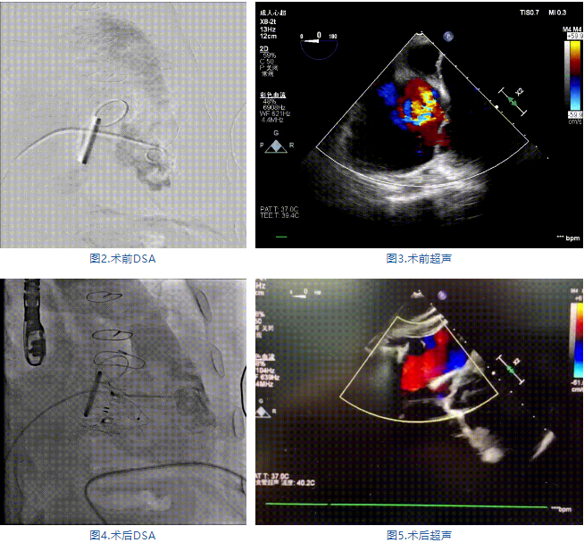 手術(shù)在全麻狀態(tài)下進(jìn)行,郭惠明教授團(tuán)隊(duì)采用經(jīng)右側(cè)頸靜脈入路的方式送入輸送器進(jìn)入體內(nèi),并在TEE和DSA的指引下進(jìn)行。在輸送器進(jìn)入右室后釋放室間隔錨定裝置,旋轉(zhuǎn)輸送器,使得錨定裝置對(duì)準(zhǔn)室間隔面;而后釋放前瓣夾持件,確定夾持件位于右室側(cè)釋放LuX-Valve Plus人工瓣膜盤片,再使用DSA和超聲確認(rèn)盤片是否位于右房側(cè),同時(shí)調(diào)整瓣膜的同軸性。緊接著在DSA和超聲的監(jiān)視下調(diào)整室間隔錨定件貼合室間隔,釋放室間隔錨定裝置。再次確認(rèn)瓣膜的穩(wěn)定性和同軸性后,將輸送器撤出體內(nèi),最終完成LuX-Valve Plus人工瓣膜植入(圖2-5),手術(shù)獲得圓滿成功。患者在手術(shù)室即刻拔除氣管插管,術(shù)后超聲提示LuX-Valve Plus人工三尖瓣瓣膜同軸性良好,瓣架固定牢靠,無反流和瓣周漏。