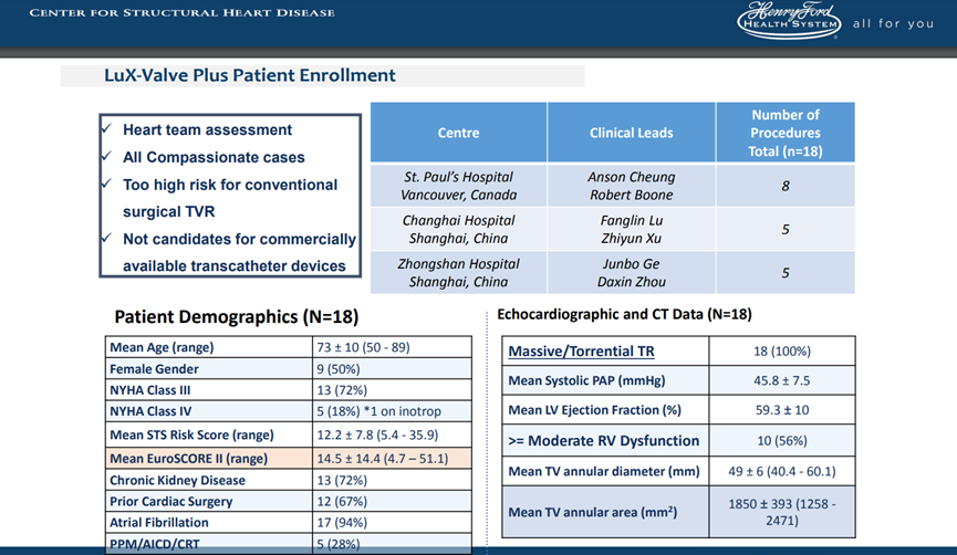 2023年6月7日,經(jīng)導管瓣膜治療會議(TVT)在美國菲尼克斯舉行。作為全球心臟瓣膜介入治療領域的頂級盛會之一,TVT吸引著來自全球瓣膜領域的專家學者的目光。在本次大會上,來自美國Henry Ford Hospital的Dee Dee Wang教授報告了關于LuX-Valve Plus經(jīng)導管三尖瓣置換系統(tǒng)的早期救治性臨床數(shù)據(jù)以及分享了LuX-Valve Plus手術術中的超聲指引經(jīng)驗。