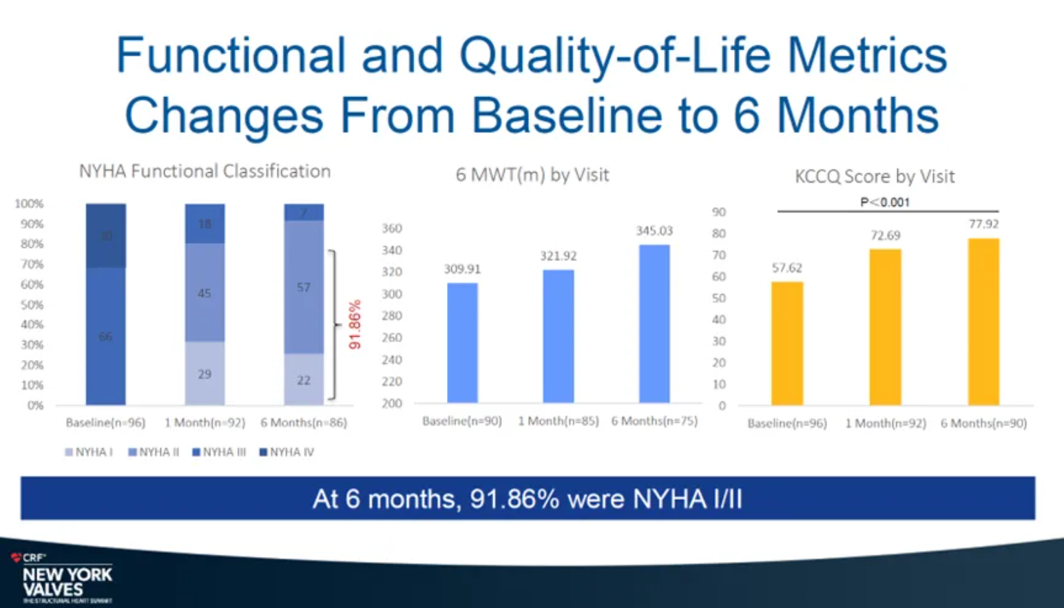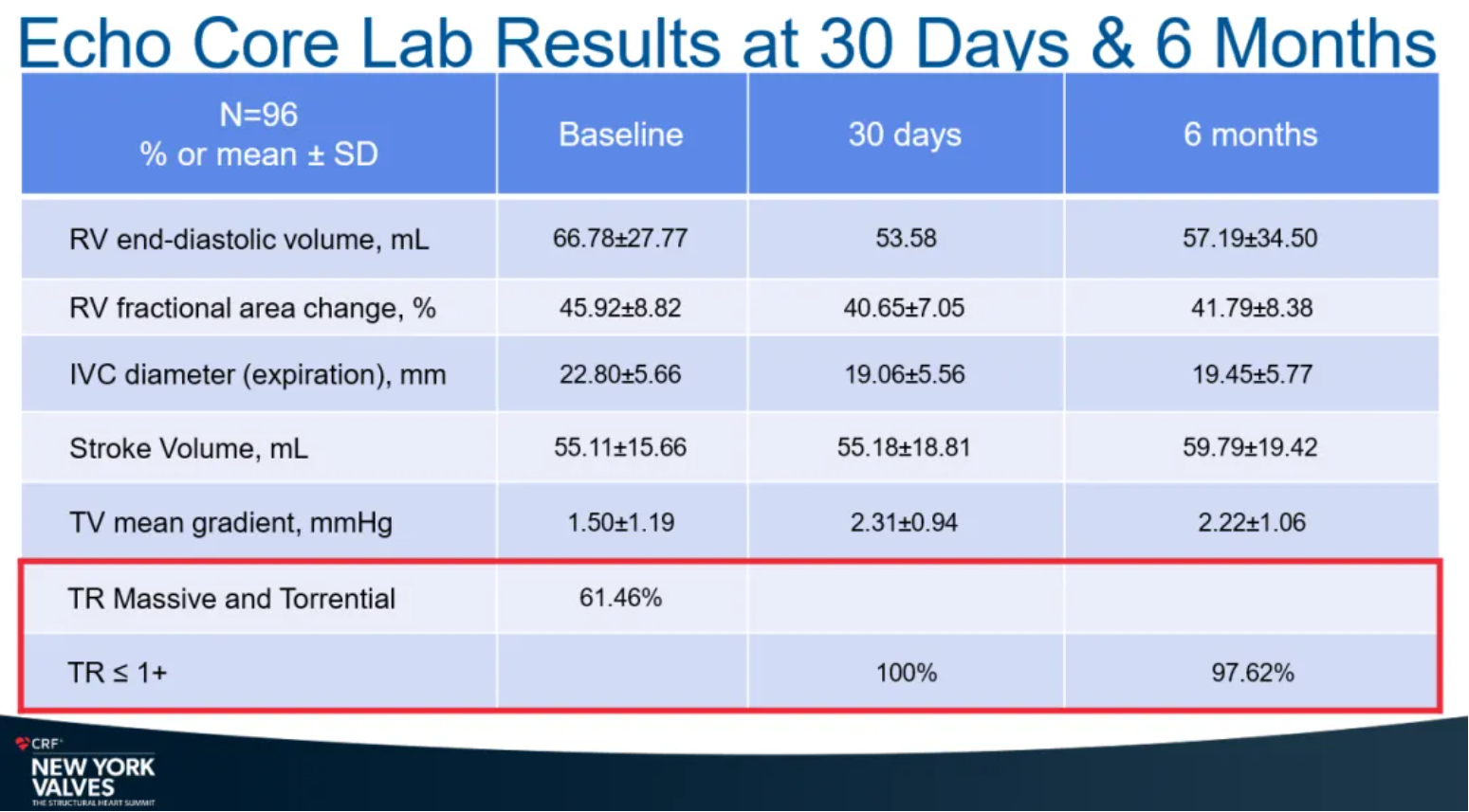 有效性結果顯示,患者的反流等級、心功能等級,以及生活質量顯著改善。100%的患者在30天顯示無中度及以上反流,97.62%的患者在6個月時顯示無中度及以上反流。同時,根據超聲數據顯示,患者右心系統重構也獲得受益。