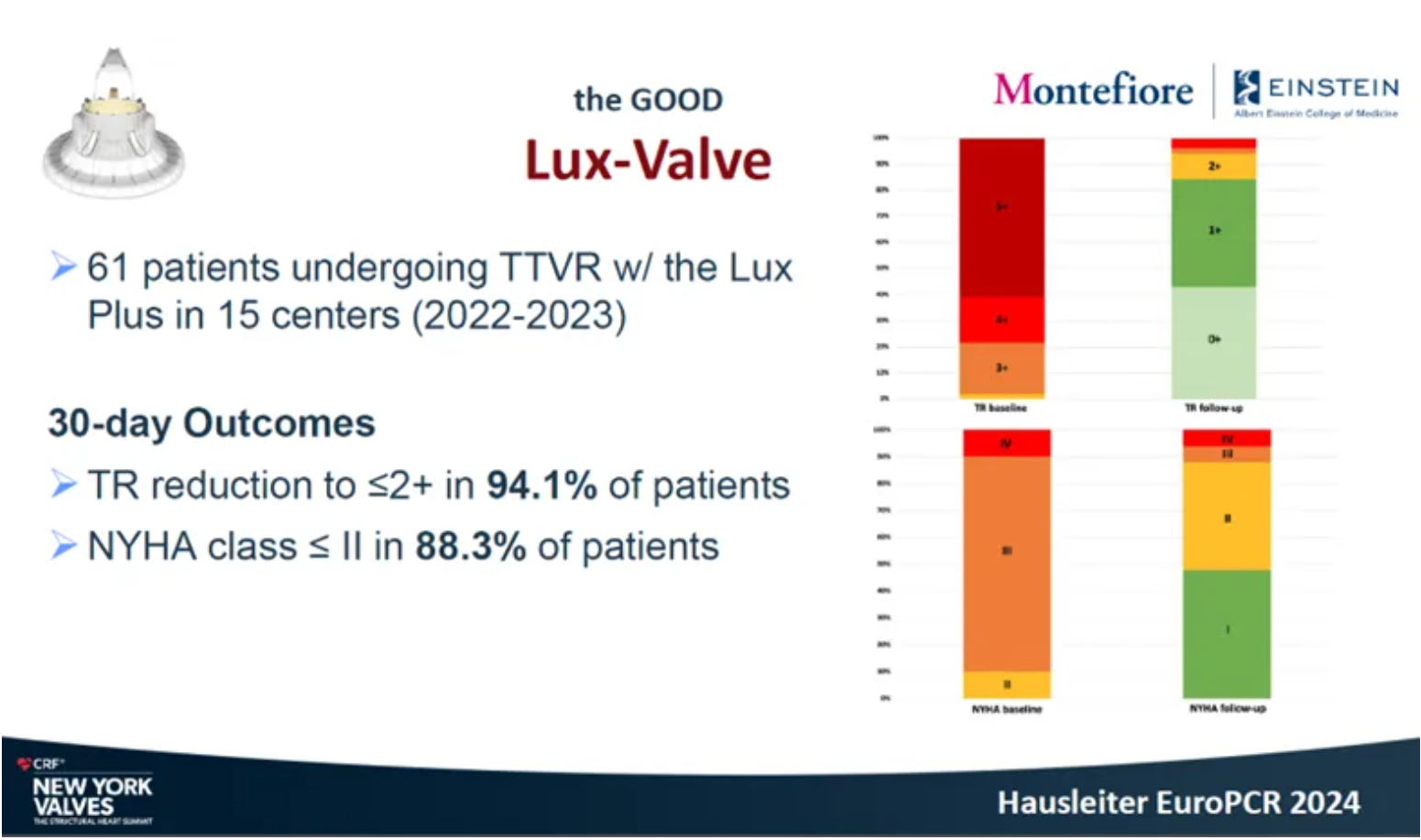 早在今年5月舉辦的2024歐洲介入心臟病學大會(EuroPCR 2024)上,來自德國慕尼黑路德維希·馬克西米利安大學醫院(Klinikum der Ludwig-Maximilians-Universität München, Munich, Germany)的Jörg Hausleiter教授公布了在全球多中心開展的同情救治使用經驗。在2024年紐約瓣膜會上,Hausleiter教授再次提及LuX-Valve Plus,并介紹到對于無法采用TEER術式的患者也是適用的,例如瓣口接合有較大缺陷和超大瓣環的患者,以及超聲影像質量較低不適合夾子術式等情況。此外,LuX-Valve Plus能夠擴大治療方式的選擇,尤其是對于超大解剖結構的患者來說,并且展示了優異的早期結果。目前,以獲得CE認證為目標的臨床試驗正在歐洲持續展開。