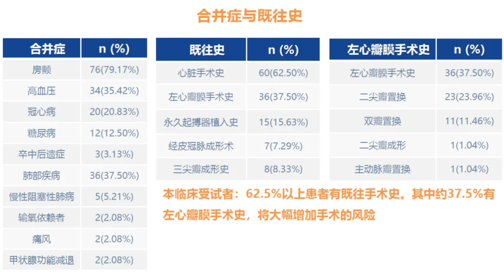 TRAVEL II 研究是一項前瞻性、多中心、單臂臨床試驗,主要用于評估LuX-Valve Plus于重度三尖瓣反流患者中應用的長期安全性和有效性。TRAVEL II 臨床試驗共納入了中國15家臨床中心的96例患者。患者平均年齡為71.35歲,平均STS評分為9.09%,37.50%的患者在研究前接受了左心瓣膜手術,15.63%的患者有過起搏器植入史,同時多合并其他基礎病,基線情況較差,存在較高的外科手術風險和接受其他方式介入治療的難度。