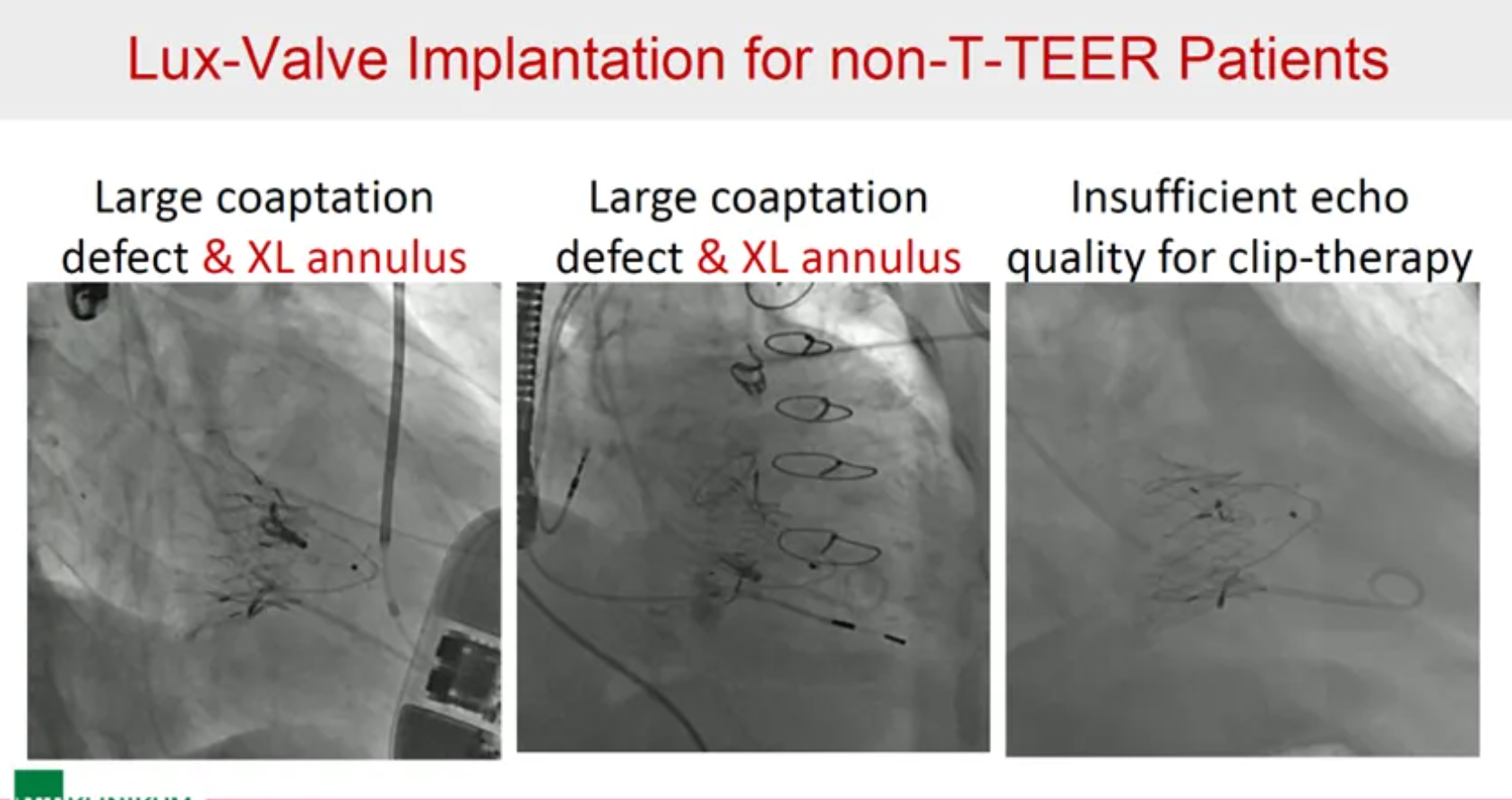 隨后在2024年紐約瓣膜會上,Hausleiter教授再次提及LuX-Valve Plus,并介紹到對于不適合做T-TEER術式的患者也是適用的,并且能夠擴大治療方式的選擇,例如瓣口接合有較大缺陷和超大瓣環的患者,以及超聲影像質量較低不適合夾子術式等情況。Hausleiter教授表示LuX-Valve Plus展現了優異的的早期臨床表現。