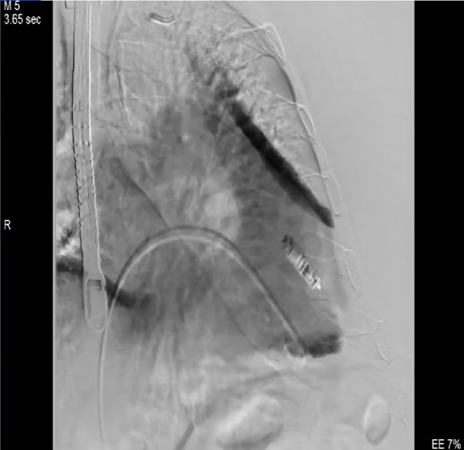 術(shù)前DSA造影可見三尖瓣大量返流呈瀑布樣,右室偏間隔側(cè)可見無導線起搏器一枚。