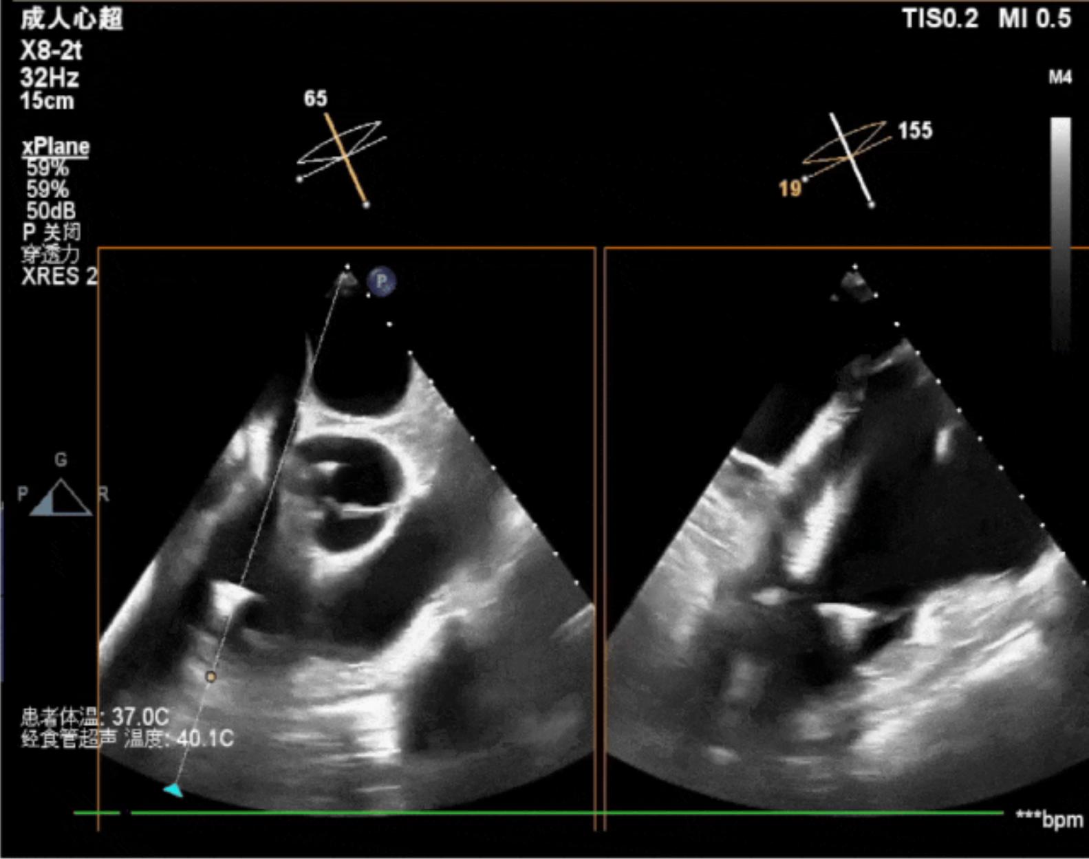 術(shù)后即刻經(jīng)食道超聲可見,三尖瓣假體瓣膜位置合適,牛心包瓣葉運動狀態(tài)良好,開閉正常,瓣周及瓣葉對合緣處未見明顯返流,心電圖及心包狀態(tài)較術(shù)前無明顯變化。