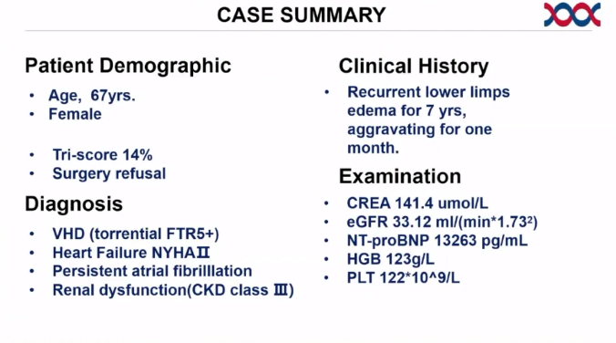 67歲老年女性,雙下肢水腫7年,加重伴氣促1年,既往診斷右心衰竭,心功能III級,伴不完全性右束支傳導阻滯,輕中度二尖瓣關閉不全,心臟擴大。初步診斷以非風濕性三尖瓣關閉不全(極重度)合并擴張型心肌病收住入院,Tri-Score 14%, eGRF 33.12ml,NT-proBNP 13263 pg/mL。