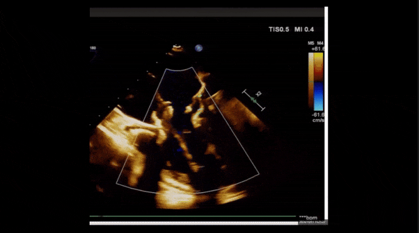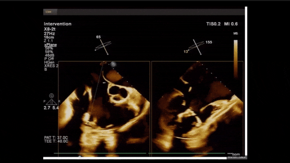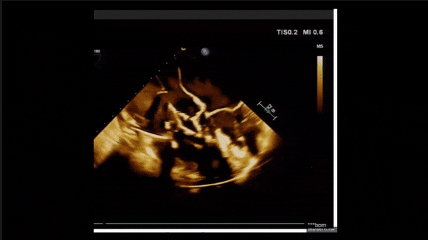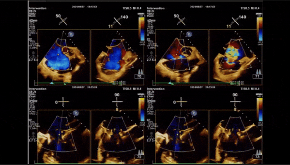 術中經食道超聲輔助下可見LuX-Valve Plus夾持件抓捕瓣葉狀態良好,夾持件在位,室間隔錨定位置良好,假體瓣膜整體錨定狀態穩固。